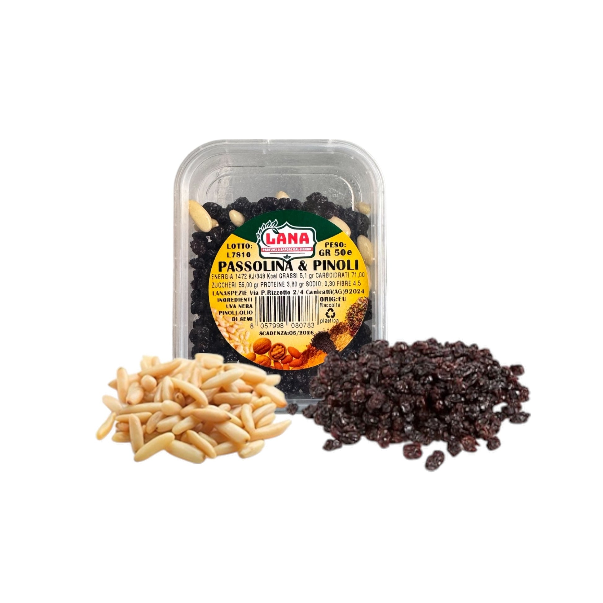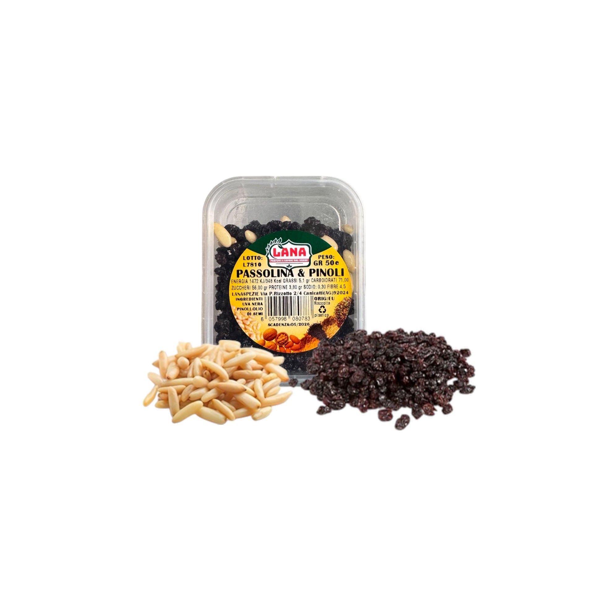 Passolina e pinoli del mediterraneo in vaschetta da Gr 50 per una comoda conservazione e riutilizzo della vaschetta, la passolina e pinoli Γ¨ il tipico piatto di pasta alla palermitana o siciliana.
