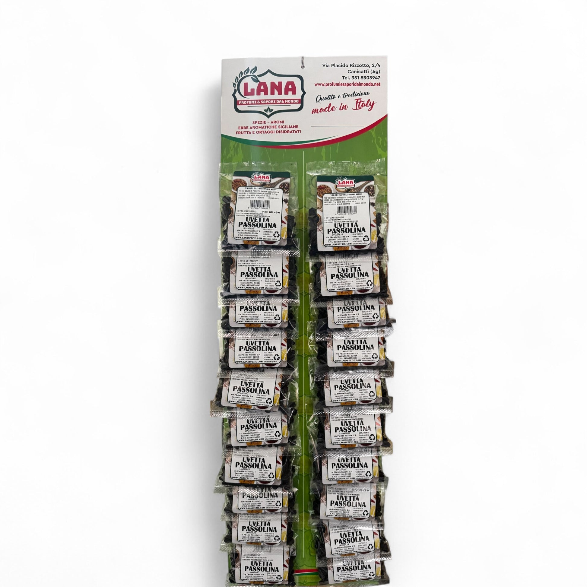 Uvetta Nera di korintho in bustina da Gr 40 confezionata e messa in espositore da appendere con 20 pz come in foto, ideale per pasta alla palermitana "passolina e pinoli"