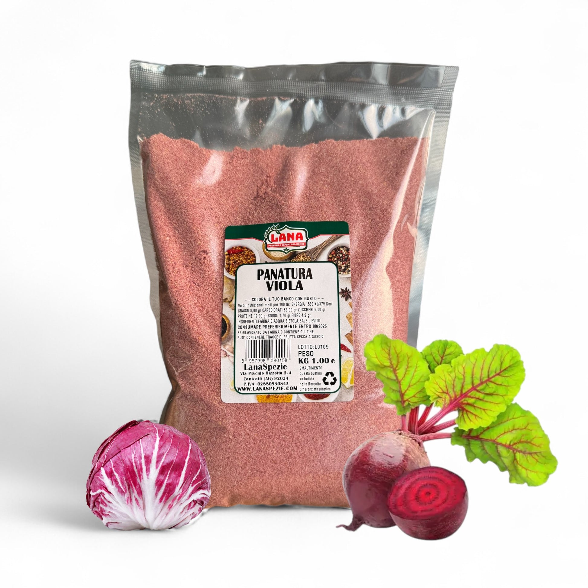 Panatura fine alla bietola viola, un mix di colori e sapori che si fondono dietro il tuo banco da macelleria, la panatura a grana fine e' l'ideale per dare un forte colore al preparato gastronomico per esaltare il banco.